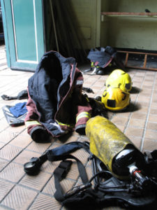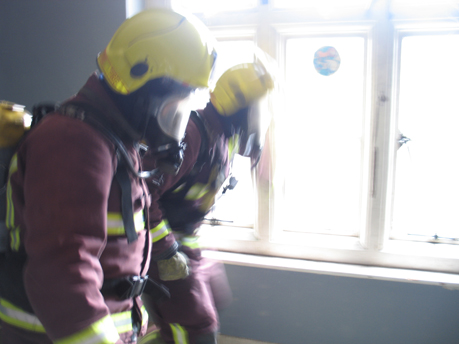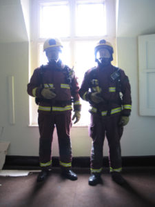 In the film ‘Looking for a reason’ two firemen to search the redundant fire station whilst wearing breathing apparatus and smoke simulator visors.